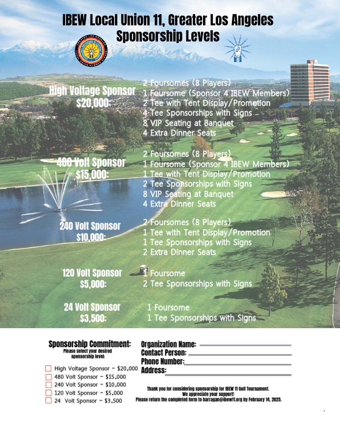 Join us for the IBEW Local 11 Charity Golf Tournament! Swing into action for a great cause as we hit the greens to support a local charity, Hollenbeck Youth Center. Hosted by IBEW Local 11, this exciting tournament brings together golfers of all skill levels for a day of fun, camaraderie, and giving back. Enjoy a fantastic round of golf, great prizes, and the opportunity to make a meaningful impact in our community. Don't miss your chance to tee off for charity—register today! Learn more about IBEW Local 11 and Visit Our Website! |